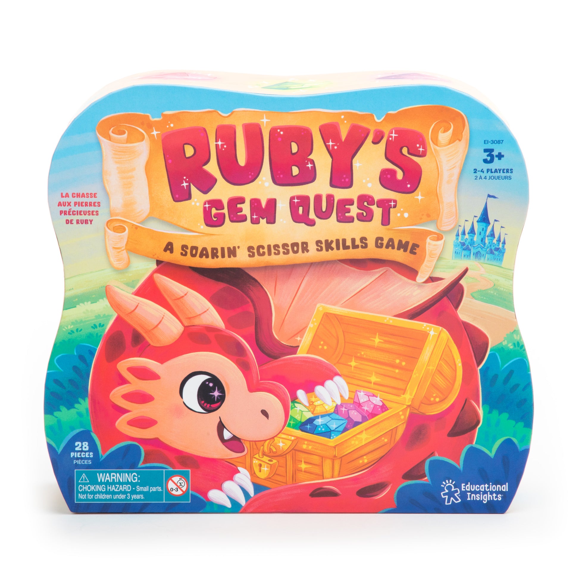 Embark on a magical adventure while helping your child build the skills they need for everyday success. Ruby’s Gem Quest is a colorful, board game that teaches young children how to use scissors through imaginative, gem collecting play.
