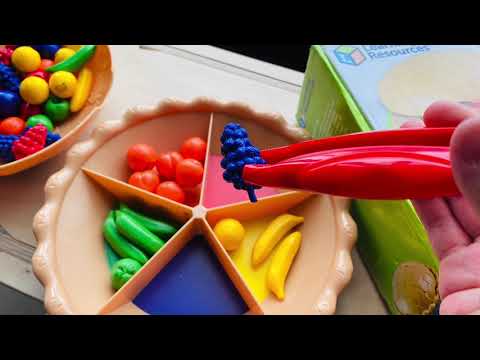 Durable plastic pie stores 60 counters (7 fruits in different colors), 3 double-sided sorting cards, removable divided insert, and 2 jumbo tweezers (Activity Guide included).